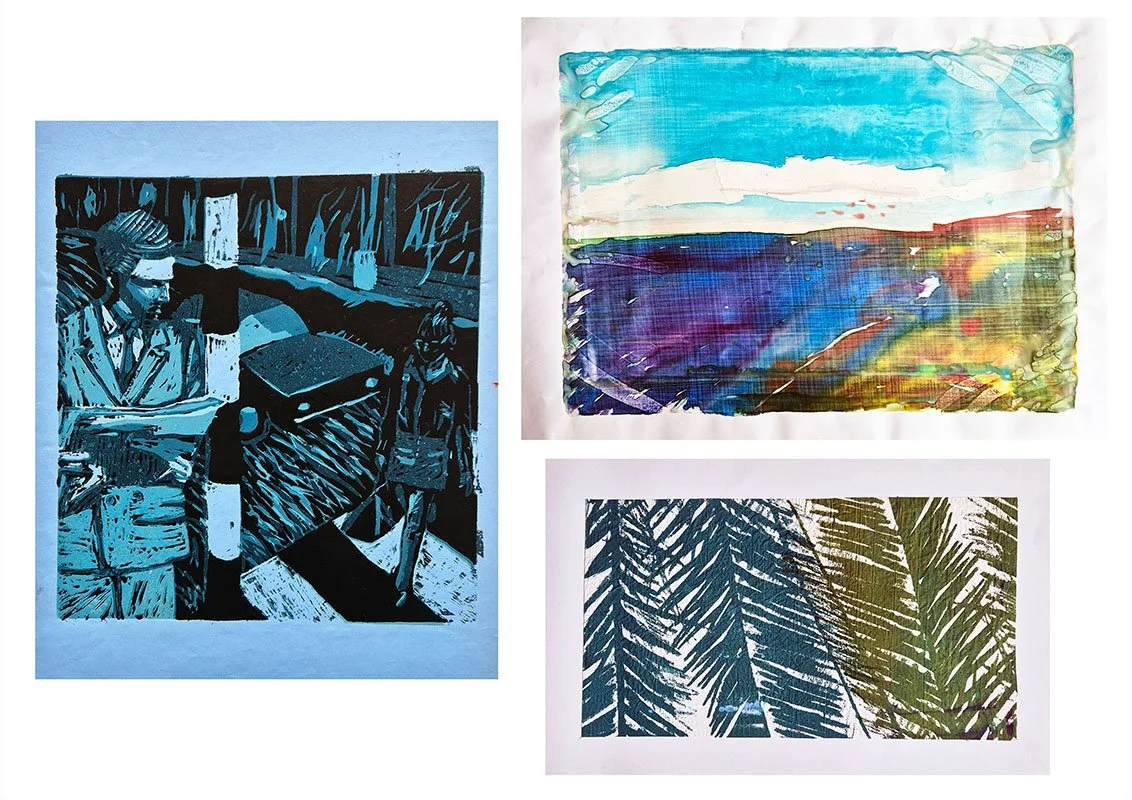 College work (left to right): Linocut, top mono screen print, bottom textile screen print