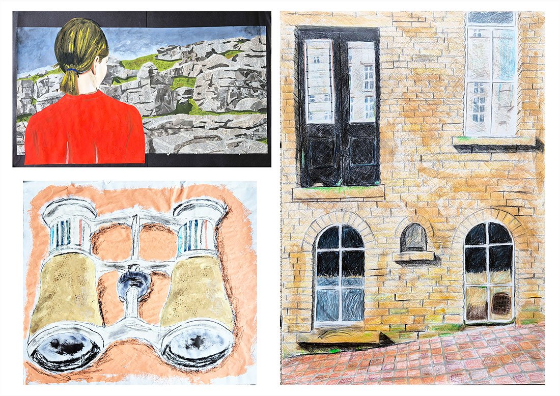 School Work (left to right): GCSE colour pencil drawing, GCSE ink painting inspired by Cezanne, A-Level Pencil drawing of my Grandad