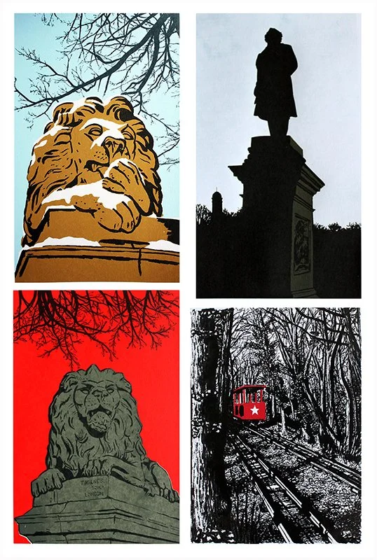 My first independently created screen prints from Leeds College of Art, Top (Left to Right) Peace Lion, Titus, Bottom (Top to Bottom) War Lion, Tram to Shipley Glen