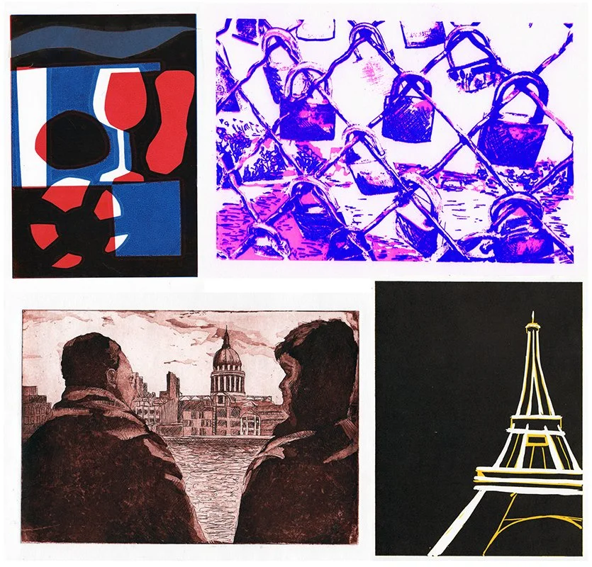 Work from Leeds College of Art 8 Week Printmaking Course most based on a trip to Paris. Methods are Monoprinting, Screen Print, Etching and Linocut