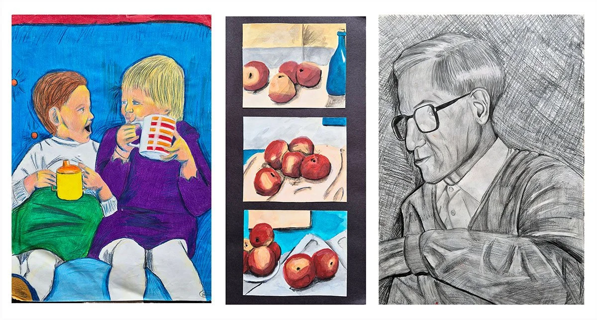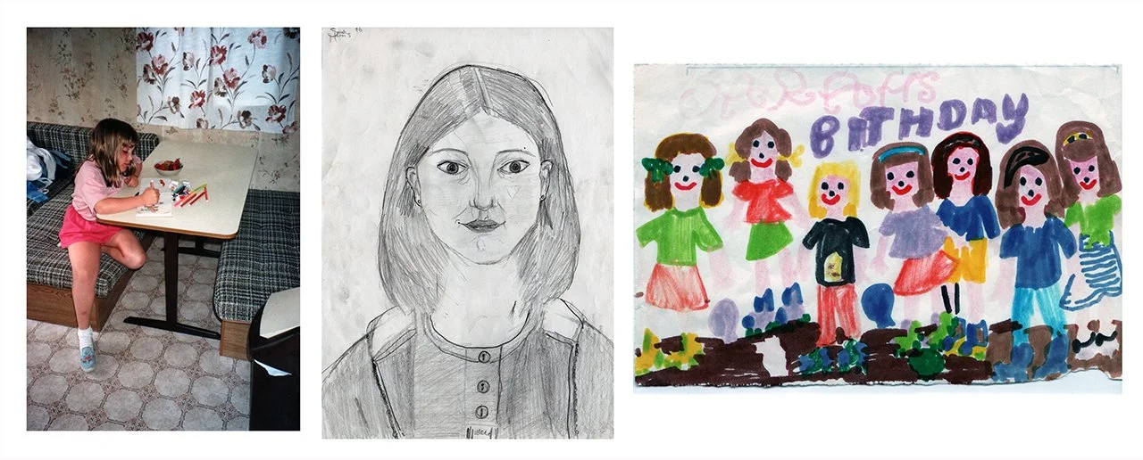 Left to Right: Drawing on a family holiday, self portrait at 12, drawing of my birthday party